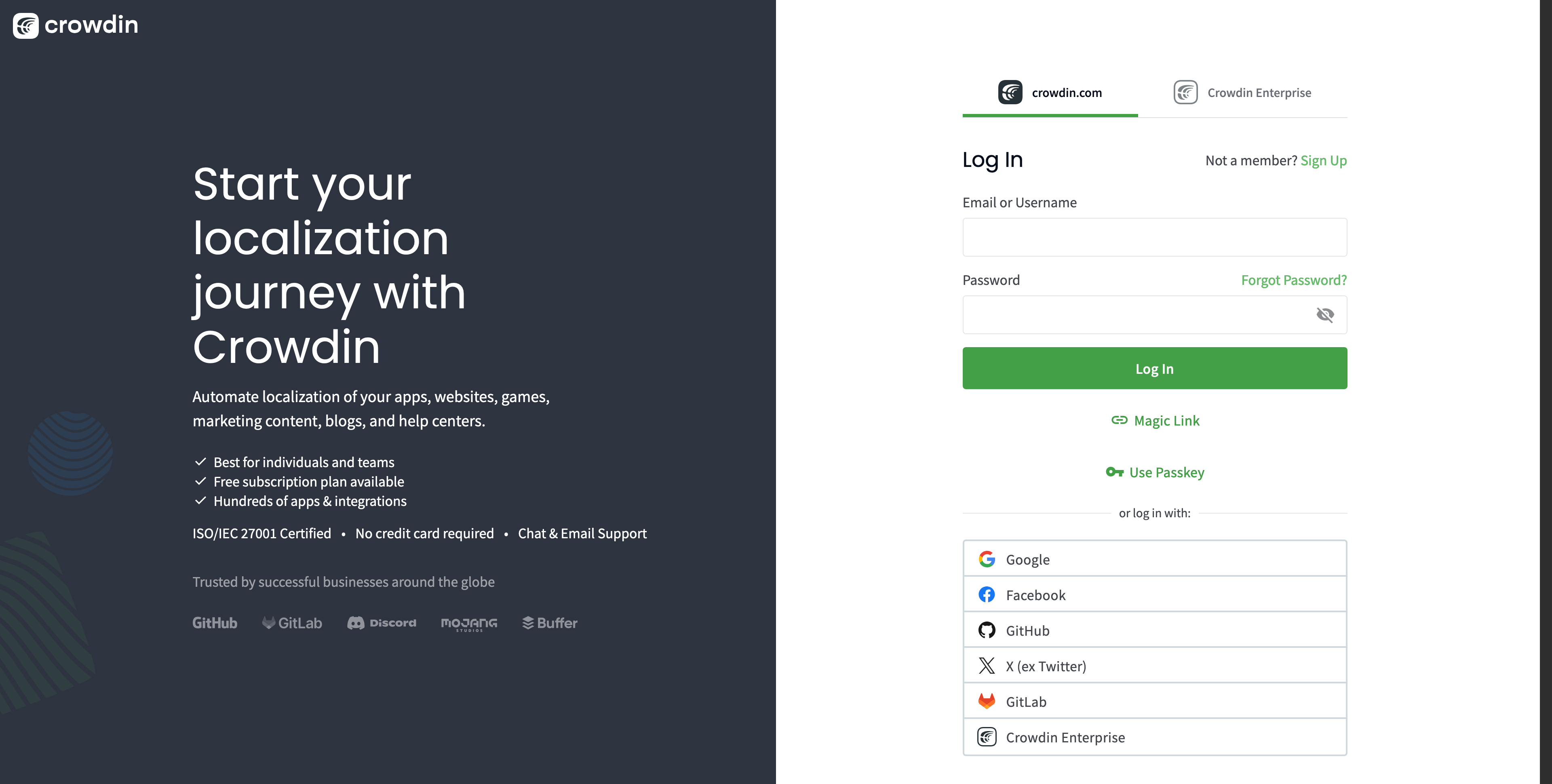 번역에 참여하기 위해서는 우선 crowdin에 가입해주세요. 많은 SSO를 지원하니 편한 로그인 방식으로 회원가입하시면 될 것 같습니다.