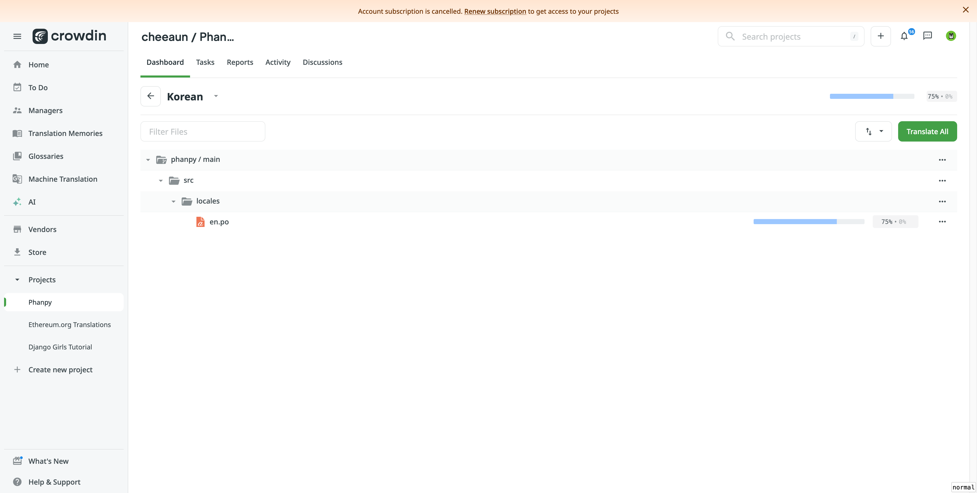 그리고 Phanpy 프로젝트에 들어갑니다. 그러면 다양한 언어 중 "Korean" 이 보일텐데 클릭해서 들어가주세요.