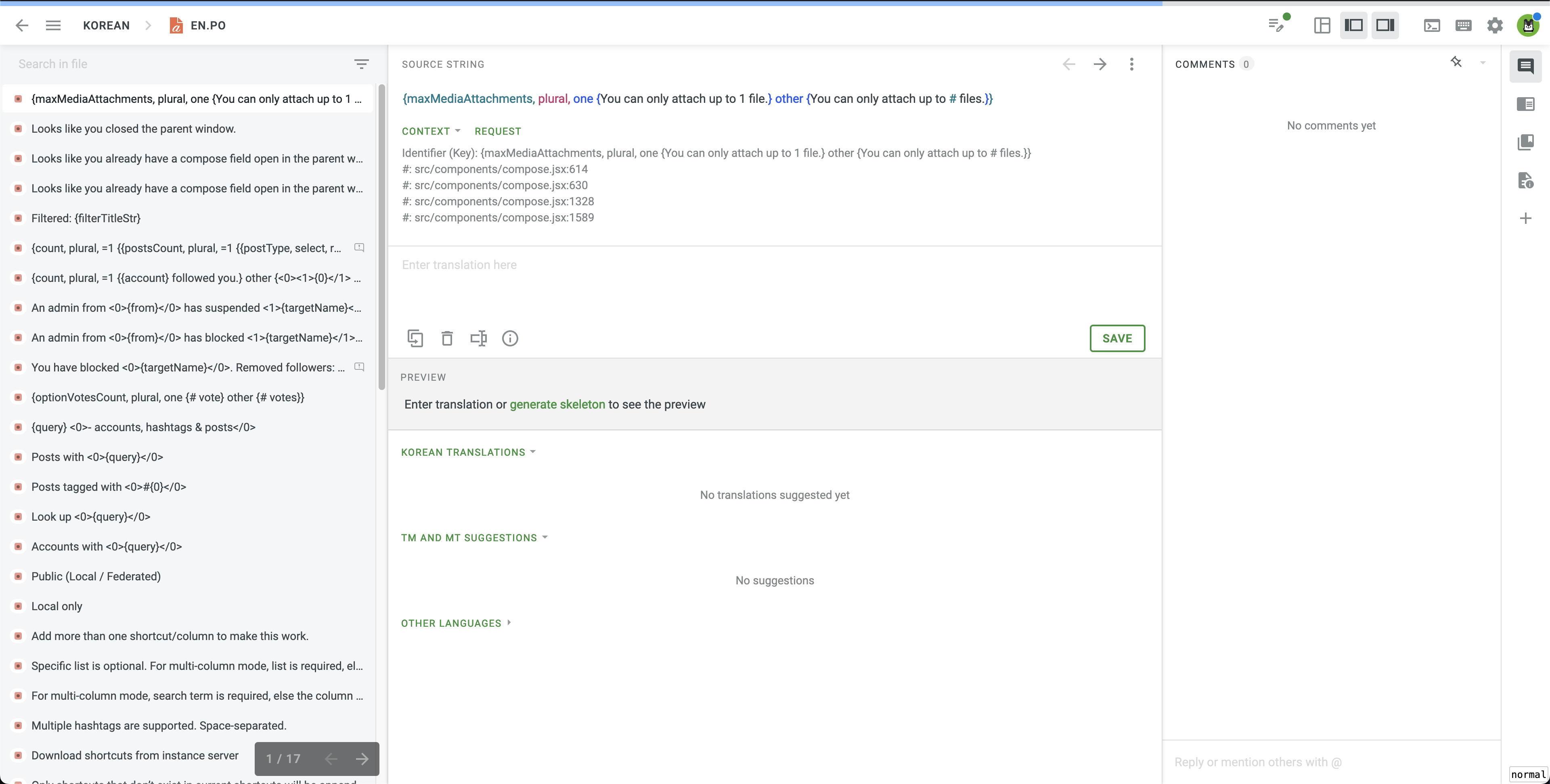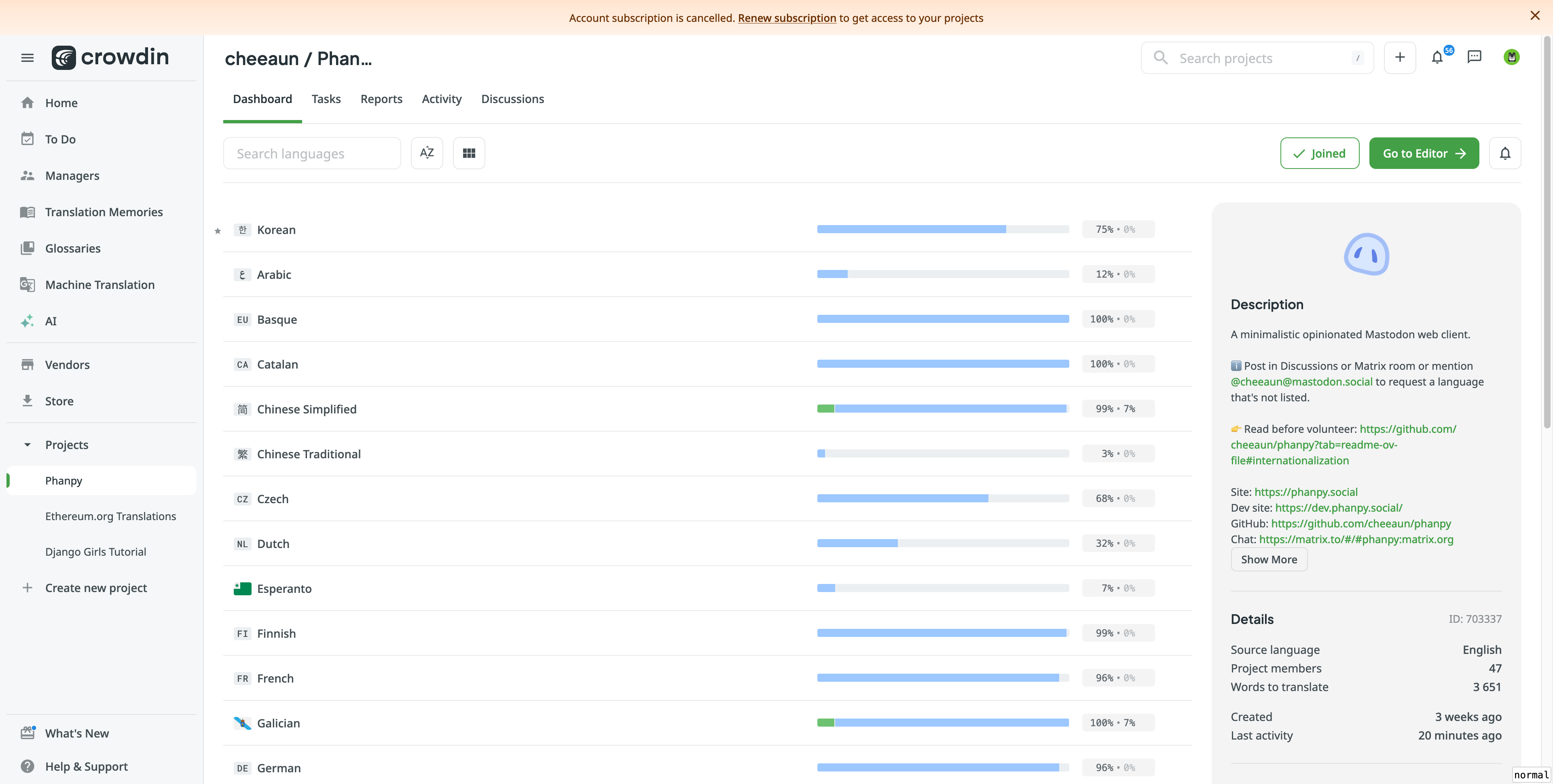 저는 FediDev KR 그룹의 번역 제안 글을 보고 Phanpy를 사용 및 번역하게 된 것이기도 하고, 이미 앞서 많이 번역해주셨기 때문에 미번역된 부분을 주로 Crowdin에서 미번역된 부분을 보여주는 기능을 통해 알게 되었습니다. 하지만 정확히 어떤 상황에서 사용되는 문장인지 모르기 때문에 단어 선택 등에 있어 어려움을 겪었습니다.