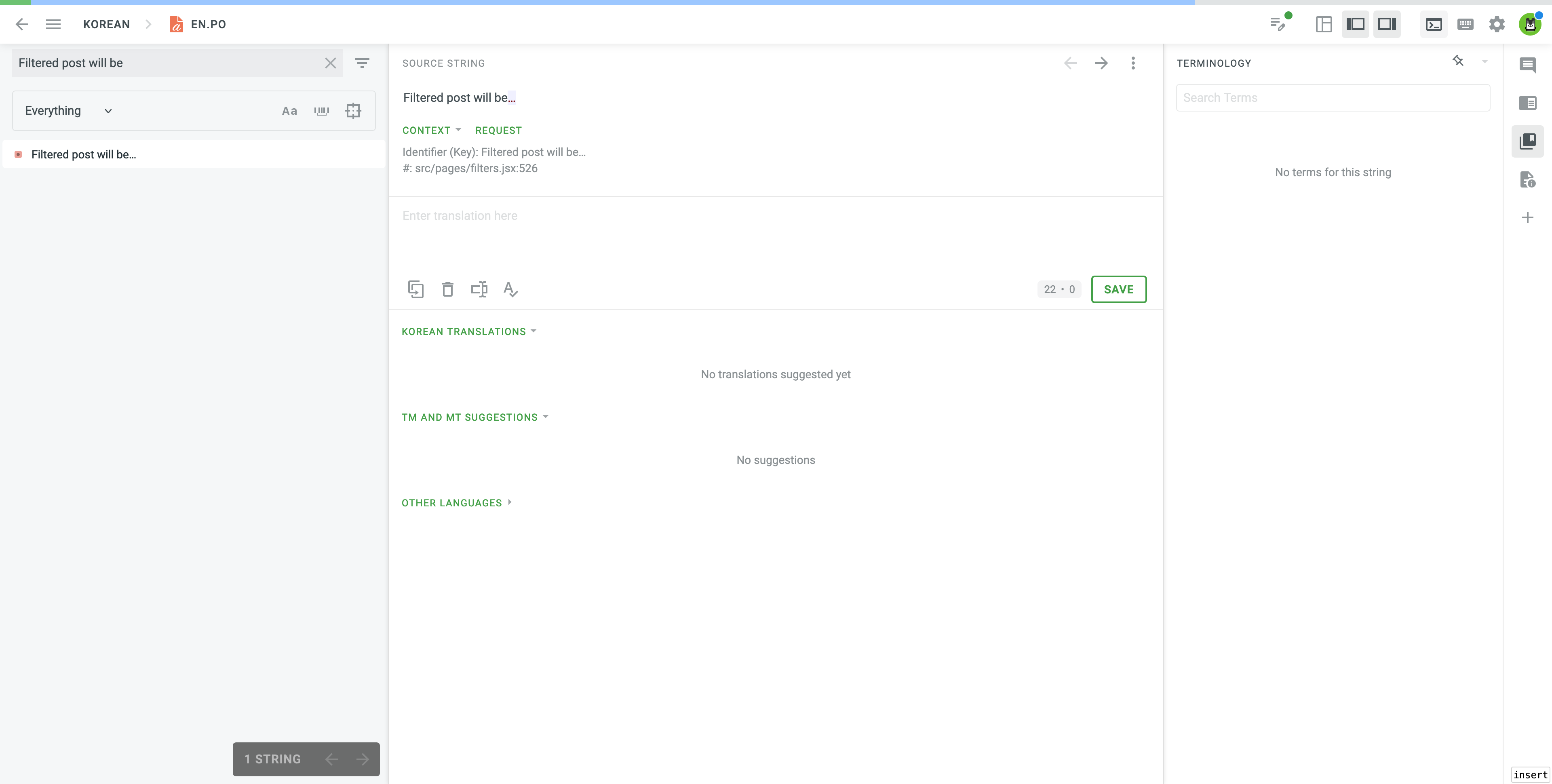 Crowdin에서 "Filtered post will be" 를 검색하면 해당 문장을 찾아줍니다.