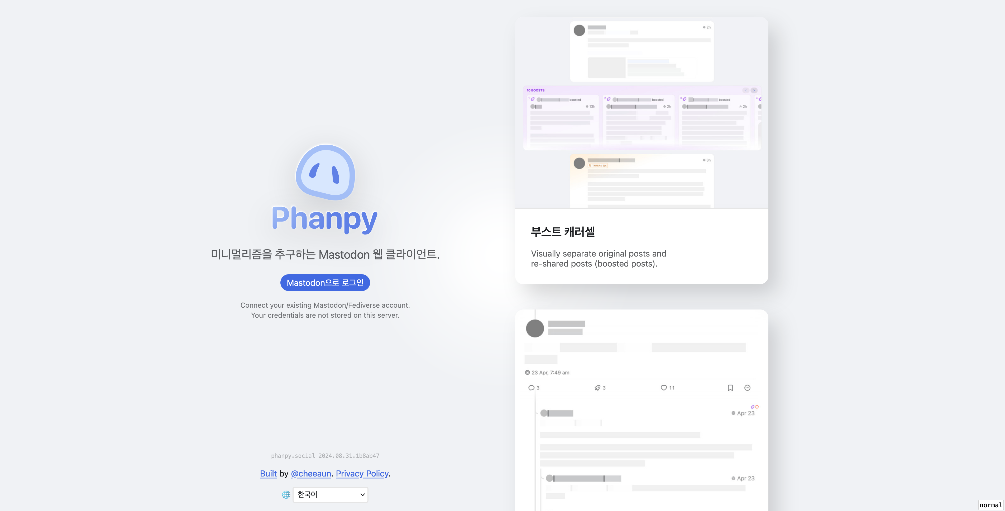 Phanpy는 cheeaun이 MIT 라이센스로 만든 미니멀 Mastodon 클라이언트입니다. 원래는 Mastodon 인스턴스에서 제공하는 기본 UI를 사용하다, FediDev KR 디스코드 서버 "아이디어" 포럼 중 번역 제안을 보고 알게되어 사용 및 번역해보게 되었습니다. 특별한 가입 과정 없이 "Mastodon으로 로그인" 버튼을 눌러 기존에 사용하던 Mastodon 인스턴스 계정을 연결해서 사용할 수 있습니다.