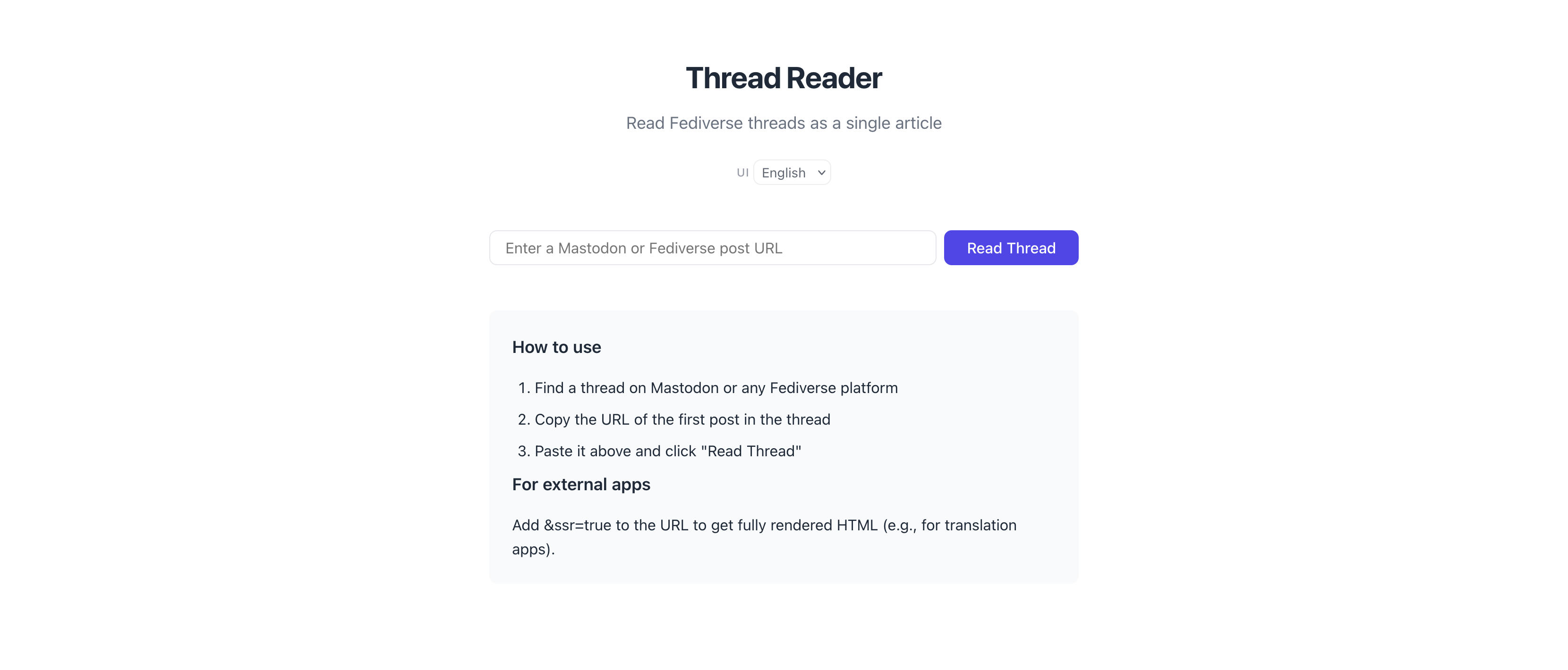 As of the time of writing, you can access it at https://ap-thread-reader.fly.dev. By default, you will be greeted with the following page.